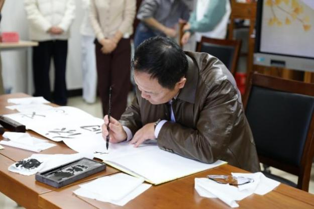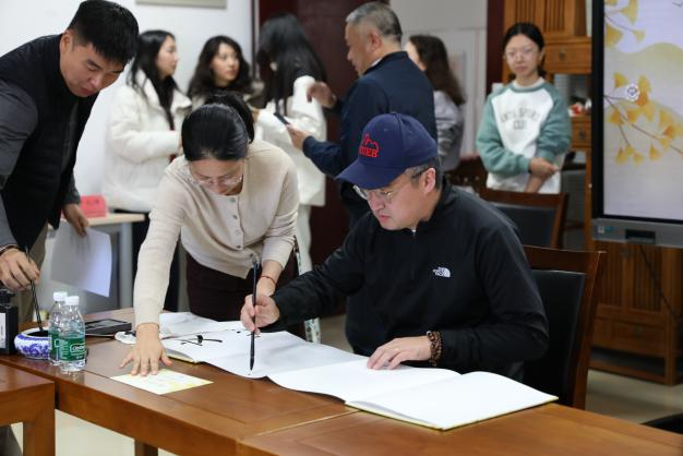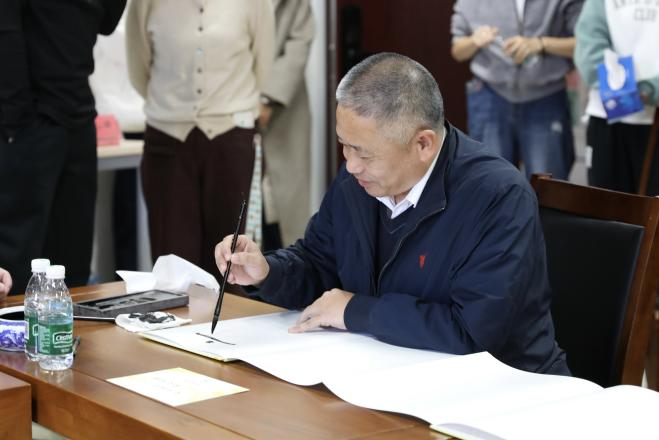 学院领导与校友代表共同完成了寄语作品。石刚与1987级、2002级、2011级的三位校友代表共同用毛笔题下“文心依旧 薪火相传”八个字,苍劲有力的笔墨彰显了学院精神的传承初心。